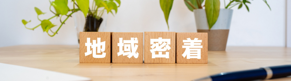 木製ブロックに「地域密着」と書かれ、観葉植物とペンが置かれたデスク